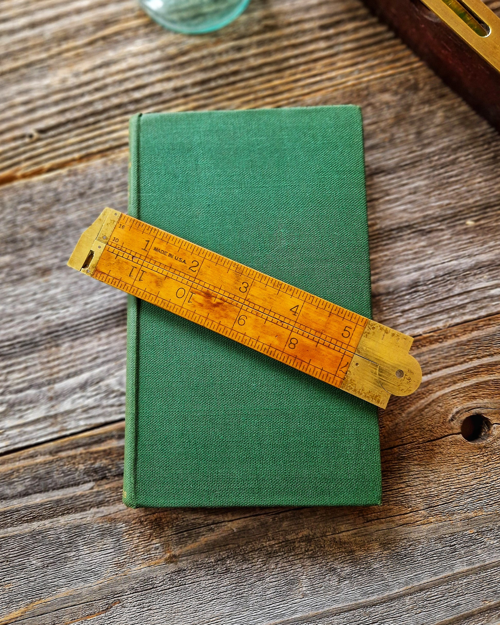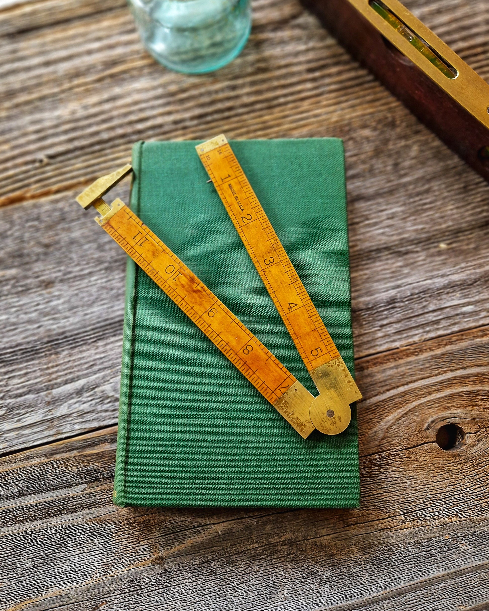 Condition notes: Very good vintage condition overall with light wear, small marks, and areas of discoloration to the boxwood consistent with age and careful use. Boxwood arms retain smooth surfaces and remain straight and structurally sound with no cracks, splits, or separation at the folds. Marked “STANLEY,” “MADE IN U.S.A.,” “NO. 36-1/2R,” and “WARRANTED BOXWOOD,” all clear and legible. Graduations along both faces remain dark and readable, including 1/8 and 1/12-inch on one side, 1/16 and 1/10-inch on the other, with the brass caliper slide graduated to 1/32 inch. Brass caliper, hinge plates, and end caps show light tarnish and minor spotting consistent with age, with no dents, bends, or damage observed. Brass hinge joints remain tight and secure; rule folds smoothly and holds position as intended. Caliper slide extends freely within its channel and functions as designed for inside and outside measurements. Rule has been lightly cleaned and polished. Other items in photos not included.