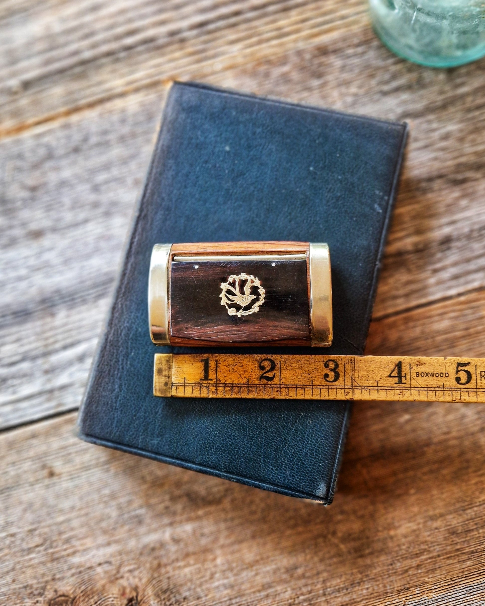 Antique Wooden Snuff Box with Inlaid Bird Motif and Metal End Caps | English Tobacciana