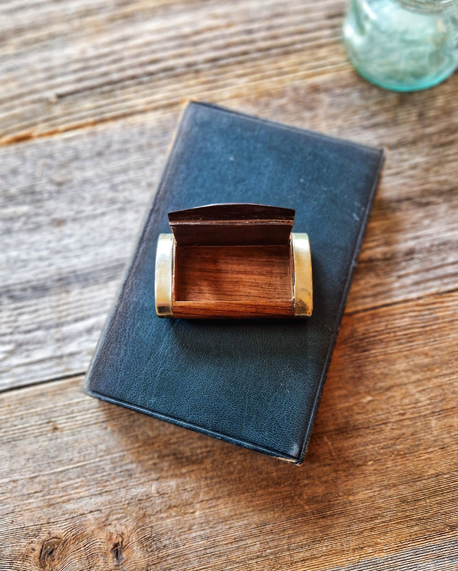 For the collector … an attractive antique wooden snuff box, dating from the late 1800s to the early 1900s, with white-metal end caps, one showing small areas of tarnish consistent with age, and a metal bird inlay set flush into the lid. Measuring just under 3 inches, the box is formed in a shallow, curved profile designed to fit into a waistcoat pocket. The lid opens and closes smoothly, and has a slightly darker tone that offers a subtle contrast with the body. Compact in scale, it would make a handsome addition to a gentleman’s bureau or side table, perhaps to hold cufflinks or a precious keepsake.
