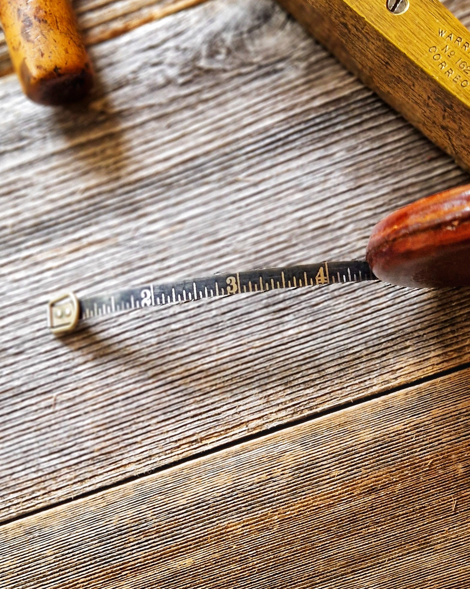 By the early 20th century, cloth tape measures—long favored for tailoring and light-duty use—were increasingly supplanted by narrow, ribbon-like steel tapes, prized for their rigidity and durability in the field. Our example is 1/4-inch wide, marked in feet and inches on one side and blank on the reverse, a design that allowed tradesmen to mark measurements in chalk or align the tape visually without interference from back-side graduations.