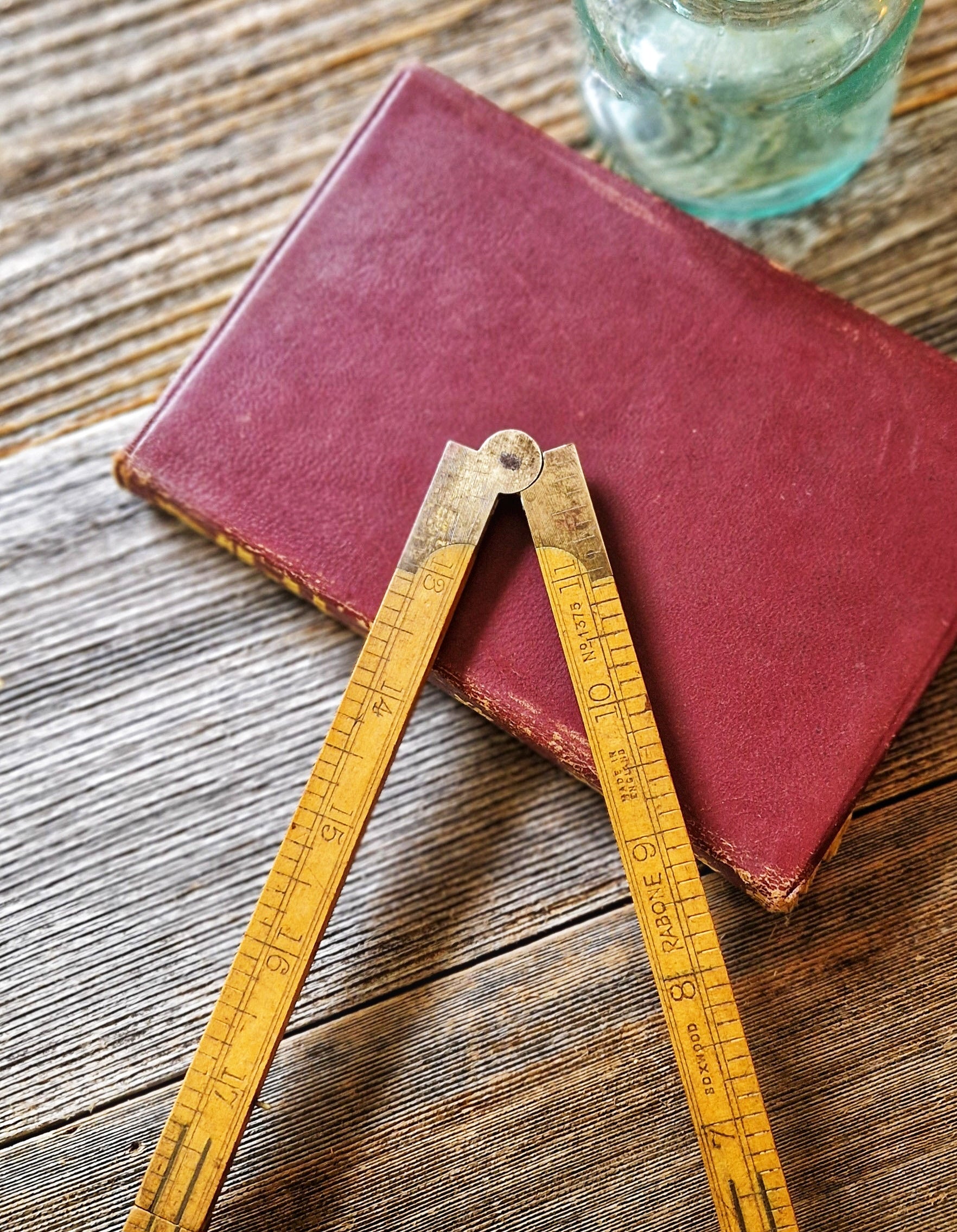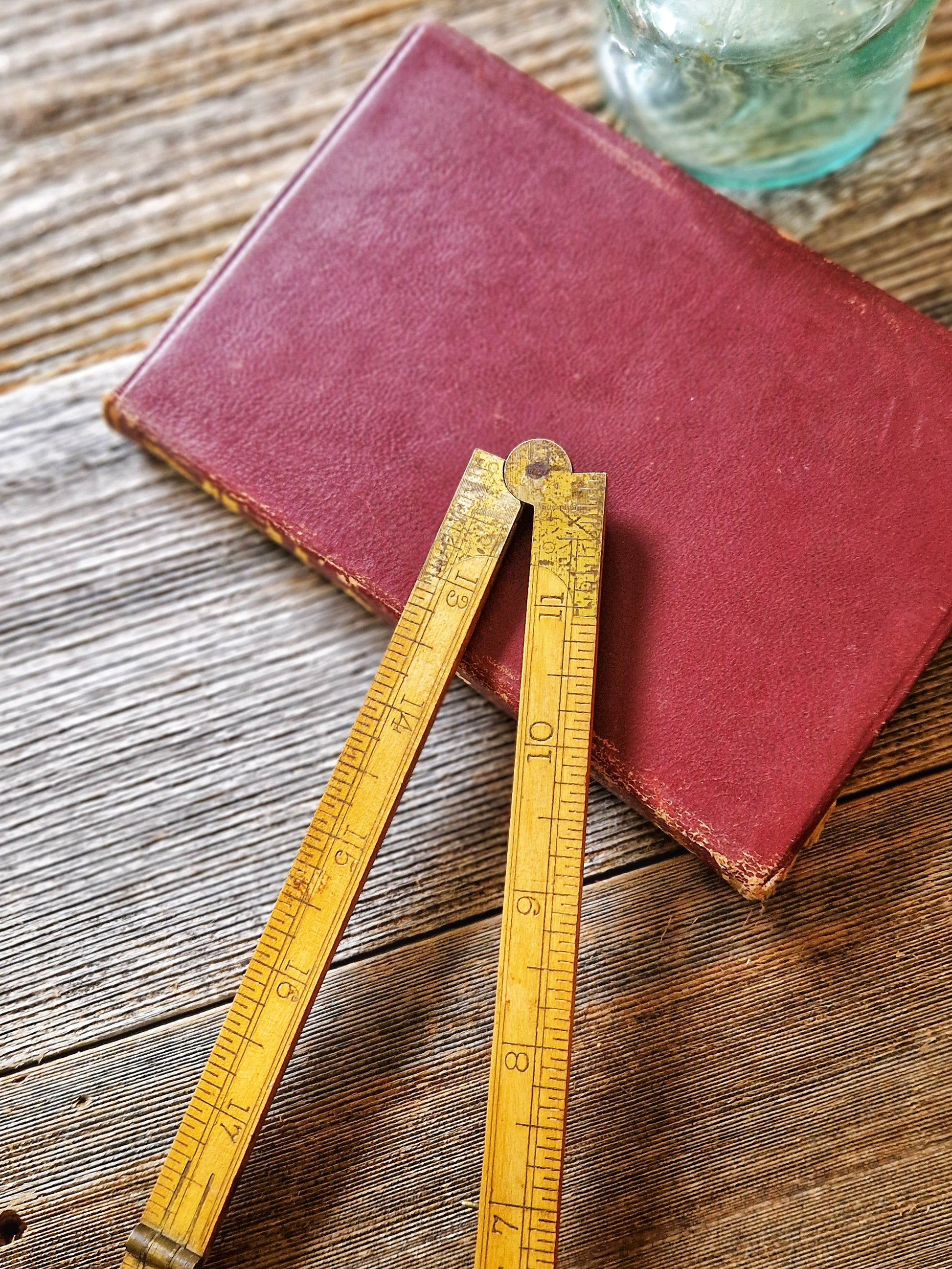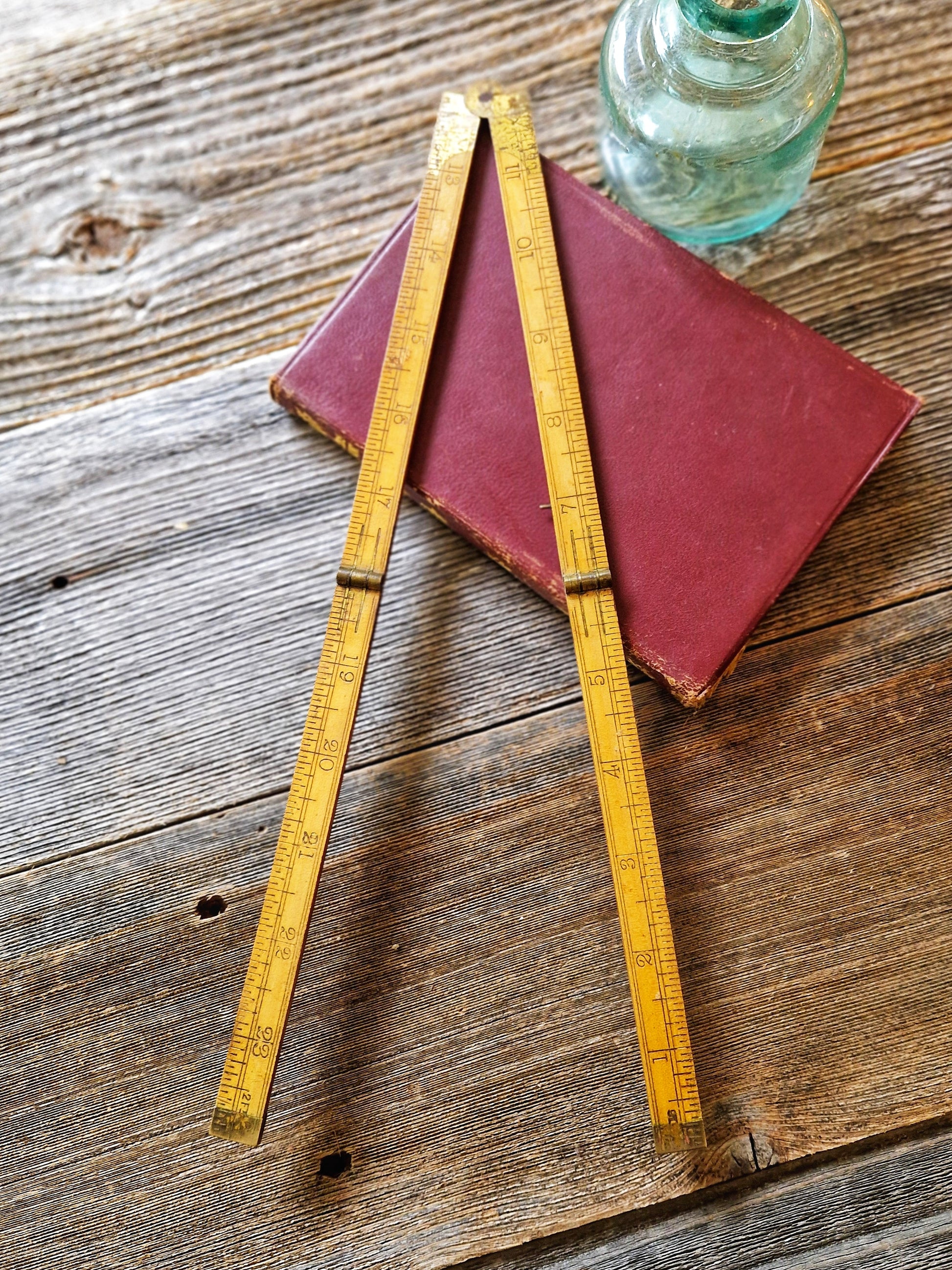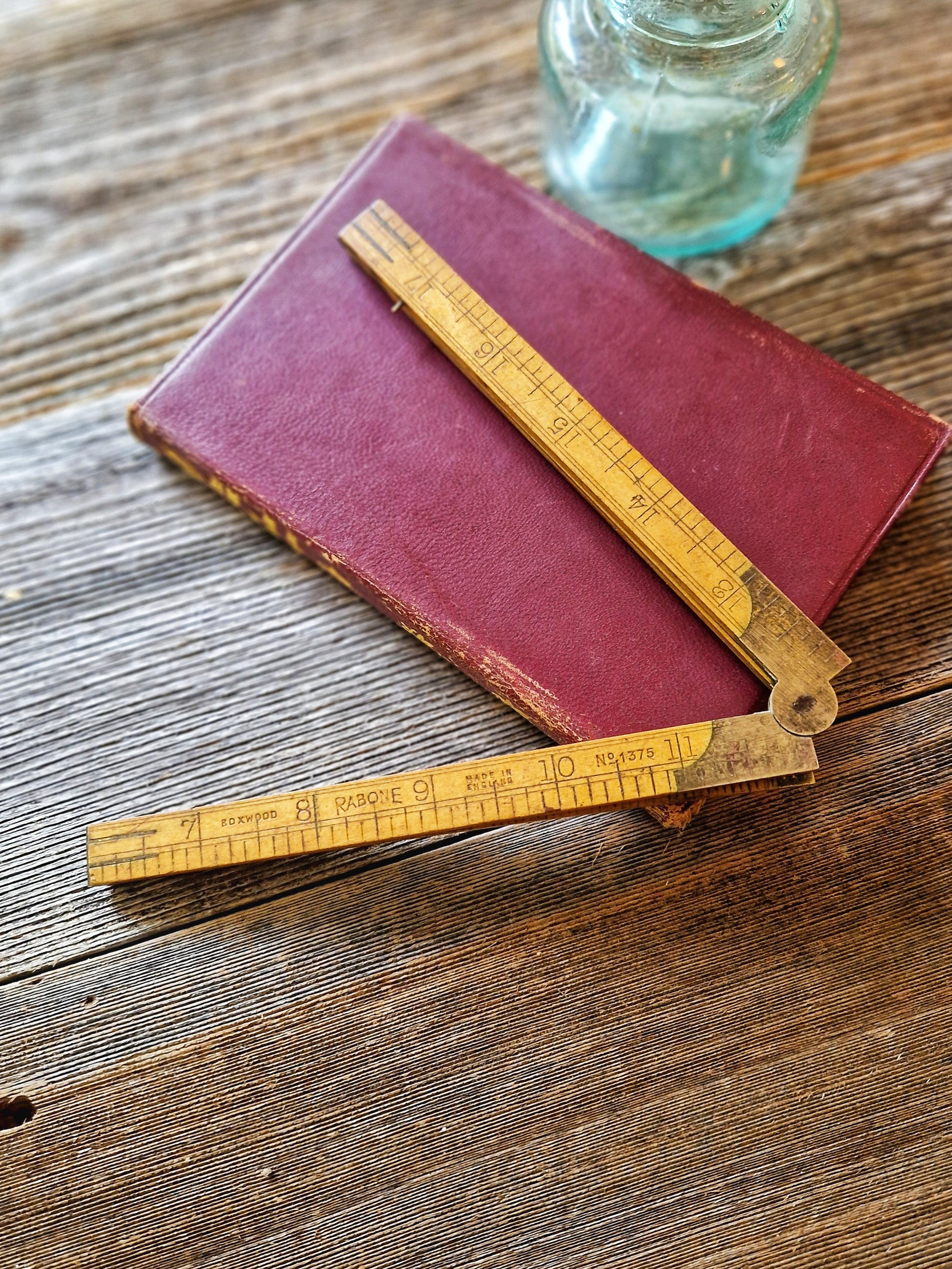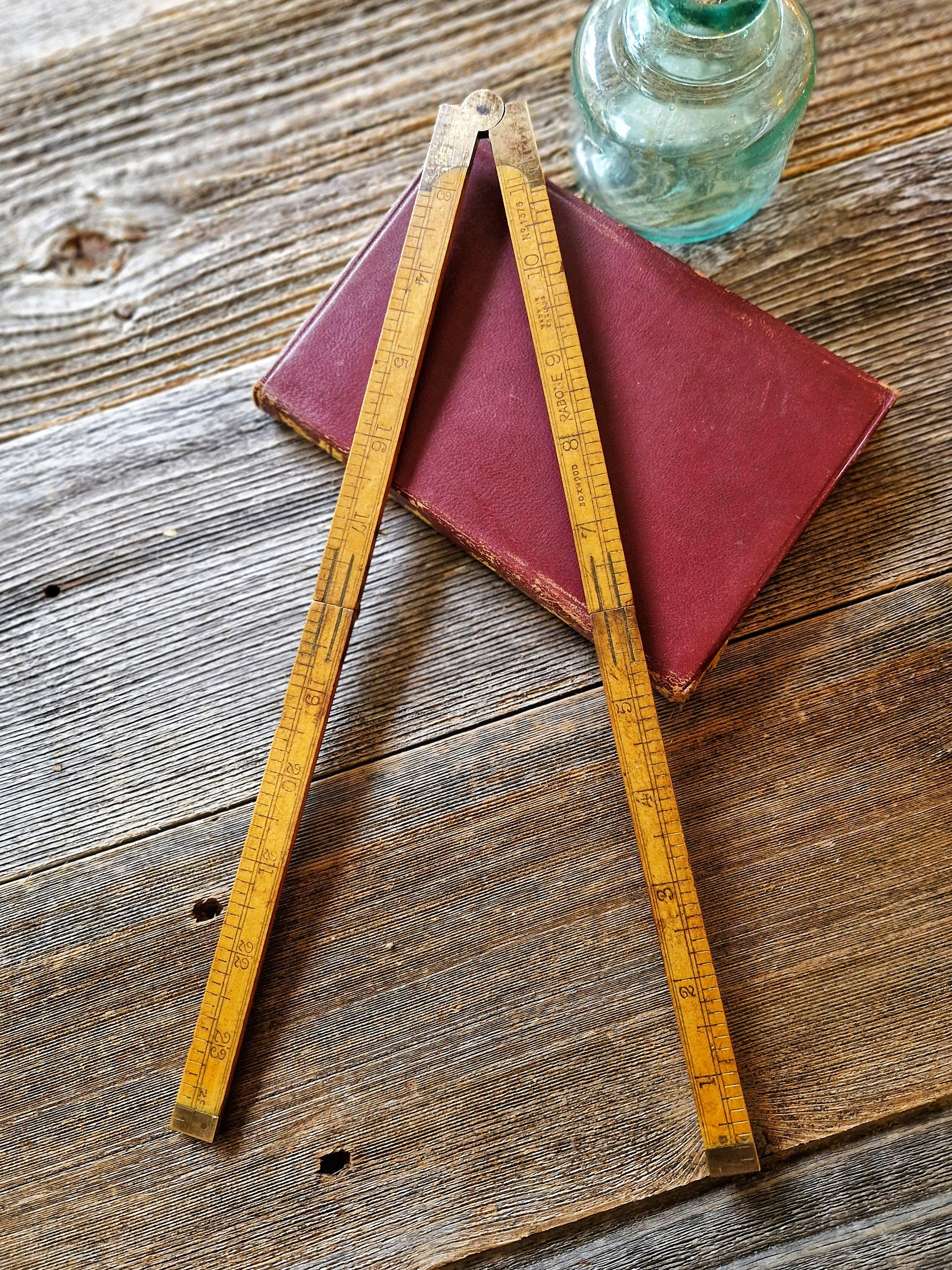 For the artisan … a classic English four-fold boxwood ruler, model number 1375 by Rabone, likely dating from the early 1950s, but possibly earlier. Measuring 24-inches when fully extended, one side of the ruler is marked in 1/8-inch increments, the other side in 1/16 inches. The brass hinges and end caps show minor tarnish consistent with age, but the ruler folds easily and smoothly, and all markings remain crisp and legible. With a rich patina, this would make an ideal gift for a craftsman, teacher, or collector of vintage tools.