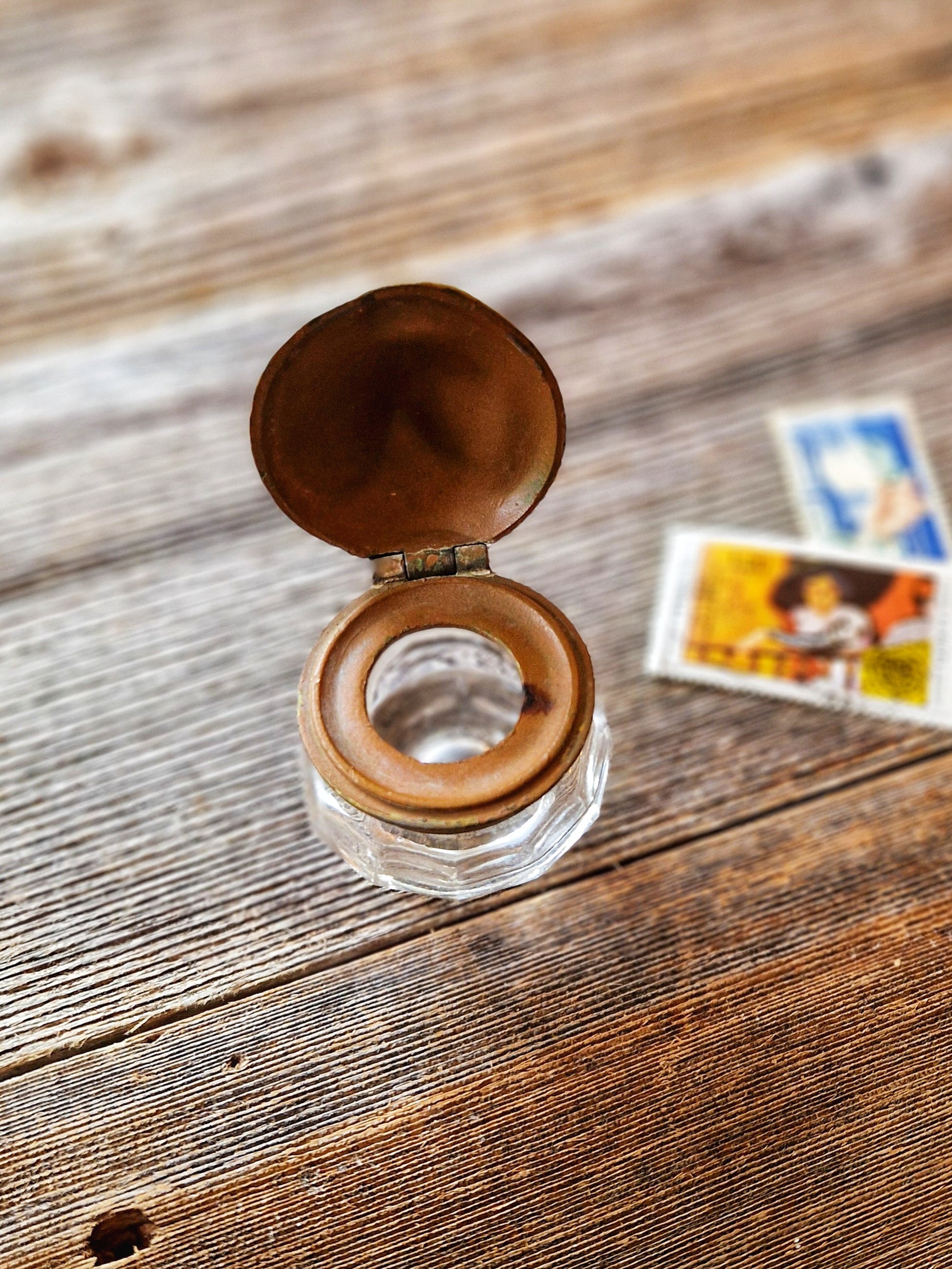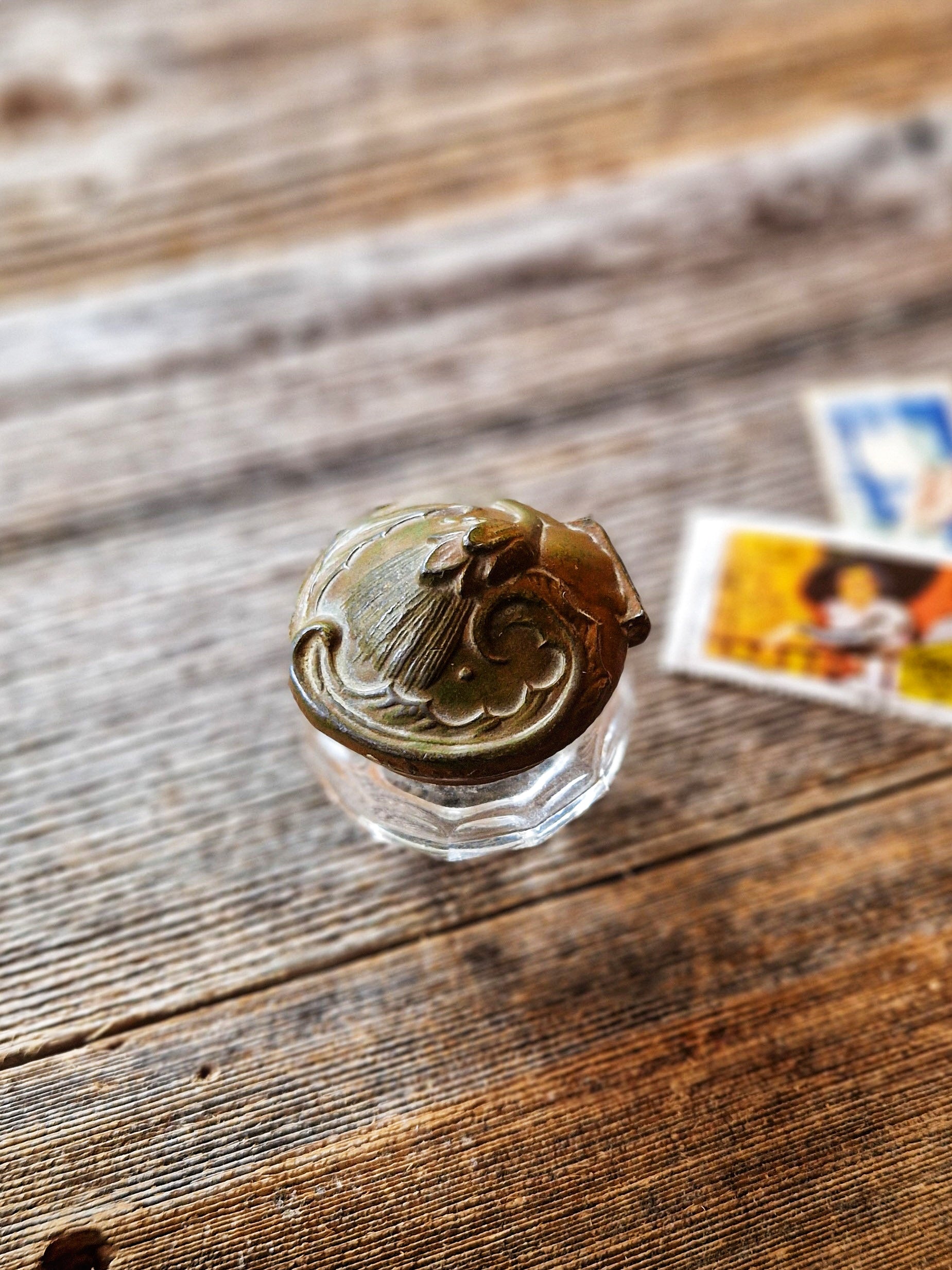 For the writer … an exquisite Art Nouveau pewter and glass inkwell from around 1900, likely either French or German in manufacture. The flowing, organic lines of the pewter lid, the stylized floral motifs, and the overall aesthetic are all hallmarks of Art Nouveau. Originally designed to sit atop a matching pewter stand, the inkwell stands beautifully on its own and would make a charming addition to a gentleman’s desk or side table.