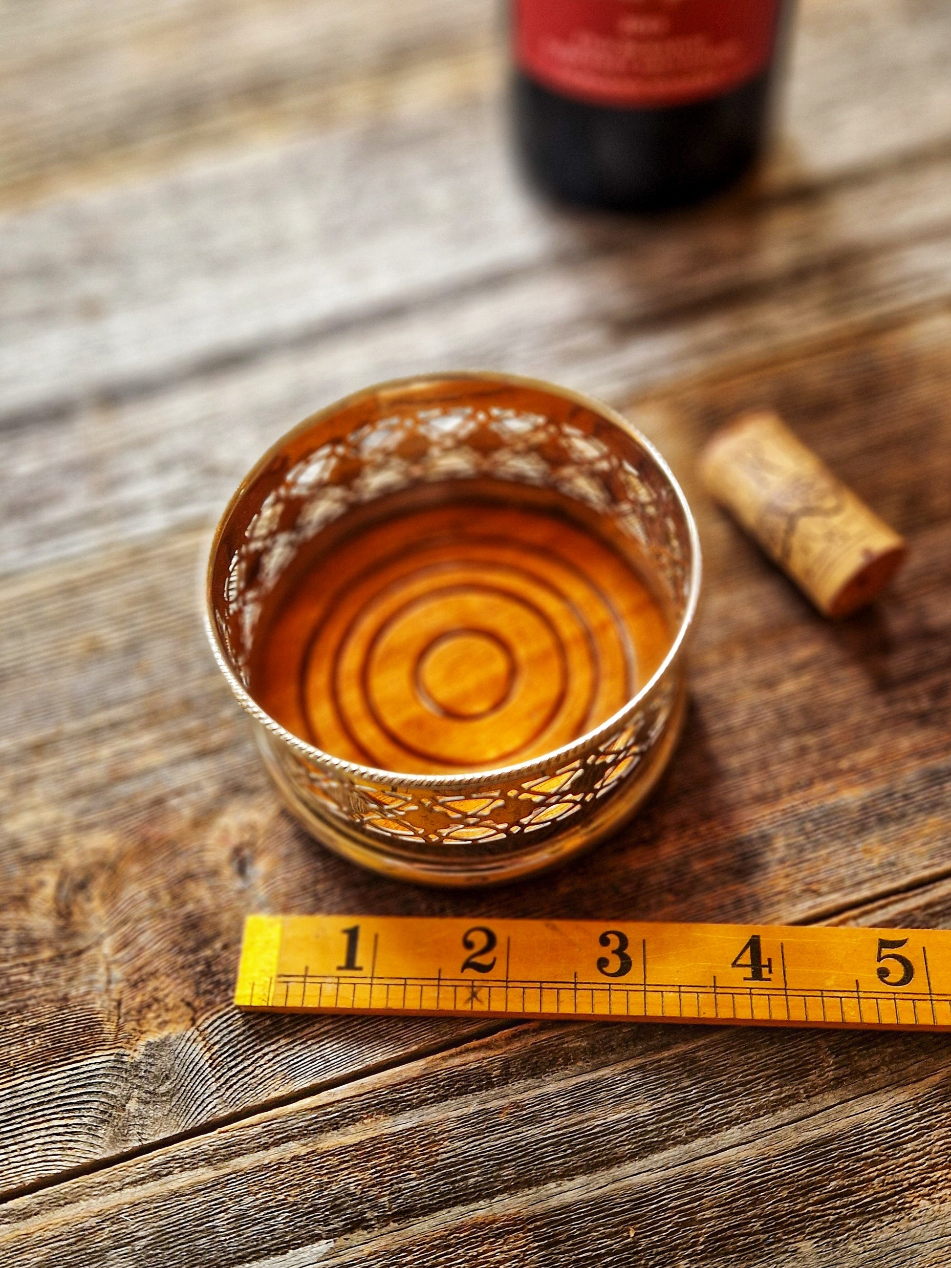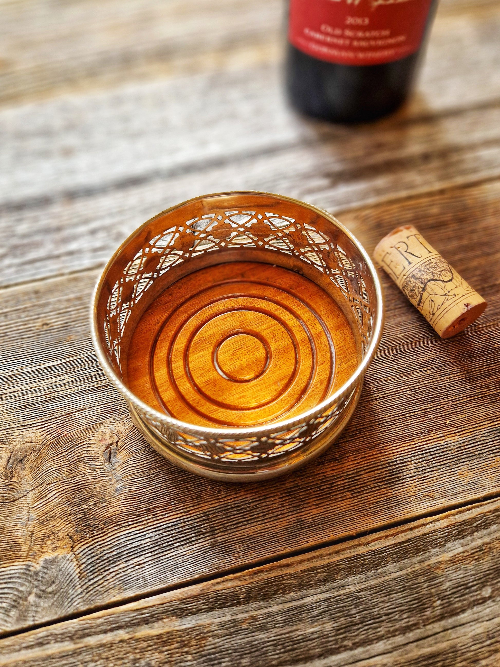 For the entertainer … an attractive vintage English silver-plated wine coaster. Wine coasters are the perfect blend of style and practicality (every home should have at least one) and add a touch of elegance to the table whilst protecting the dining surface from drips and spills. This particular piece features an intricate openwork lattice design and a finely turned wooden base with concentric ring details. In excellent condition with minimal signs of wear, it would make a thoughtful gift for the host extraordinaire or wine enthusiast.