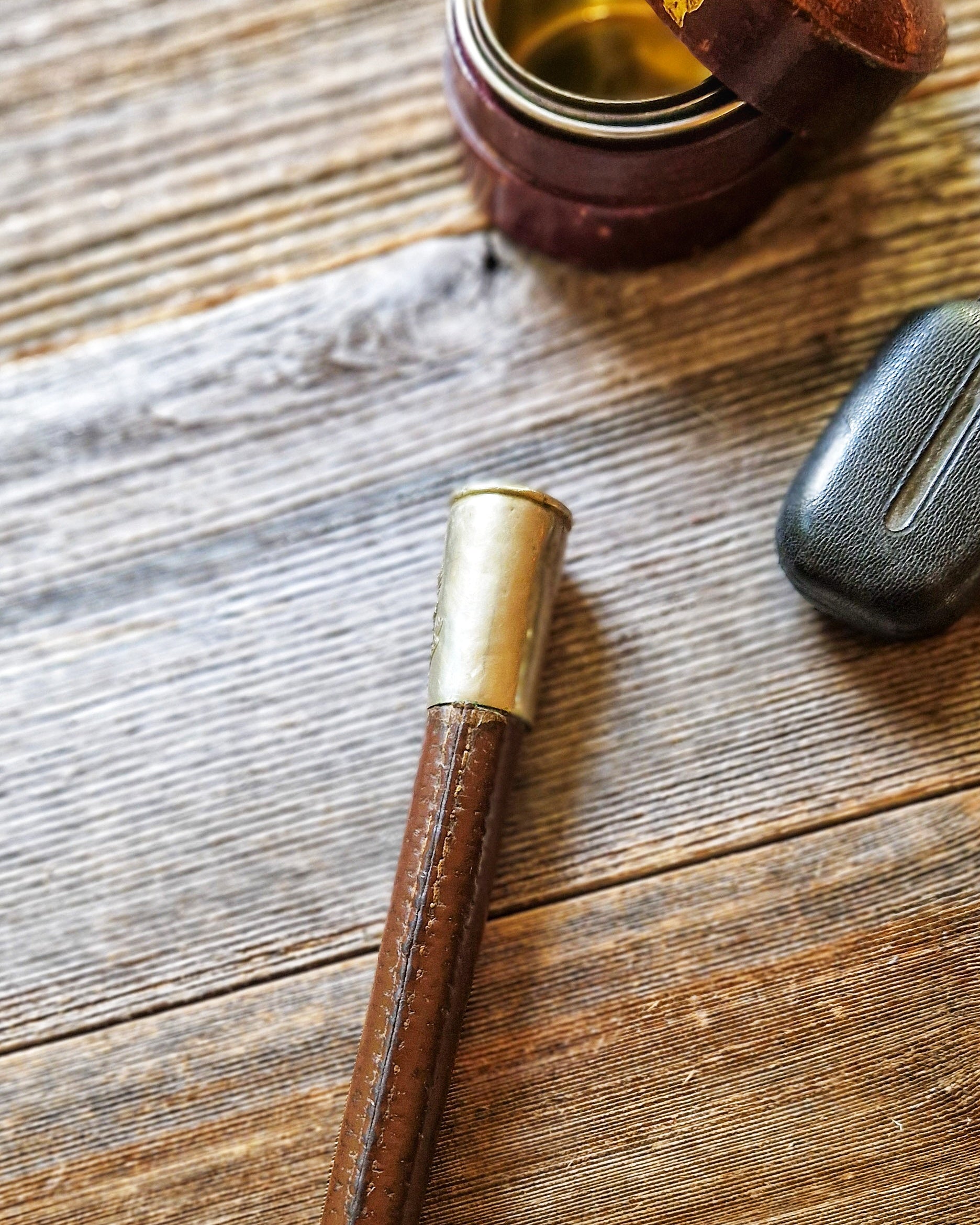 For the traditionalist … a regimental officer’s riding crop, dating to the 1930s-1940s, with nickel silver top engraved for the 14th/20th King’s Hussars. At 34 inches long, it features a cord-bound shaft, leather-wrapped handle, and original leather loop at the tip, all in excellent condition. High quality crops like this were both functional and symbolic, used on horseback and carried as part of an officer’s kit. As a distinctive piece of British military history, it would be a unique and treasured gift for a collector, equestrian, or anyone with an interest in regimental tradition.