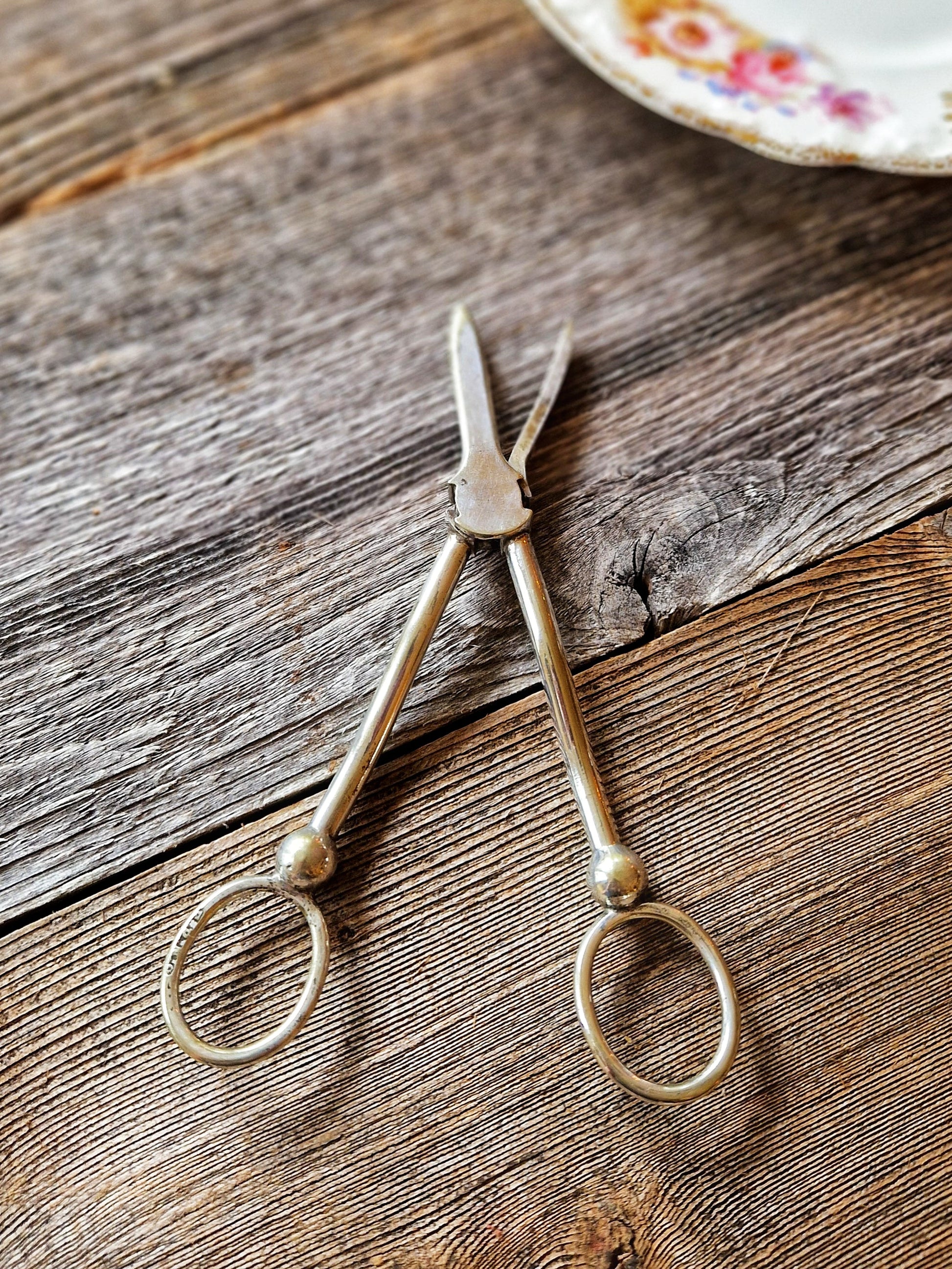 Grape shears emerged in the mid-1800s as a response to the strict dining etiquette of the Victorian era. They were designed to allow diners to cut small clusters of grapes from larger bunches without using their hands, which would have been considered improper at formal dining tables. Grape shears typically feature long handles and short blades, often with ornate decorations, and many include a flange on one blade, as this pair does, to help transfer the cluster of grapes to a serving plate. Grape shears were a staple at dessert courses, where grapes were often displayed in elaborate centerpieces.