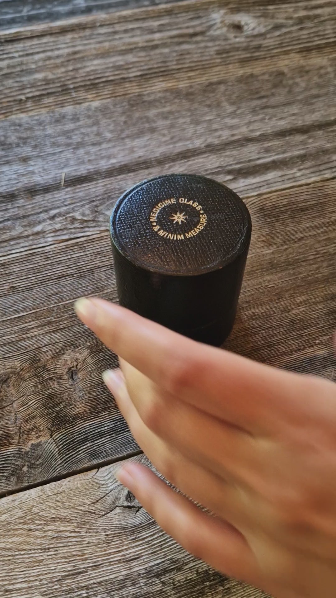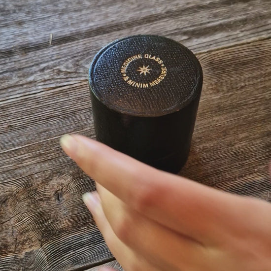 A beautifully preserved English medicine glass in leather case, possibly from the 1930s or earlier, used for measuring out liquid medicines. The larger glass cup displays hand-engraved marks for teaspoons, the smaller glass for “minims,” a measurement equivalent to one drop of water.