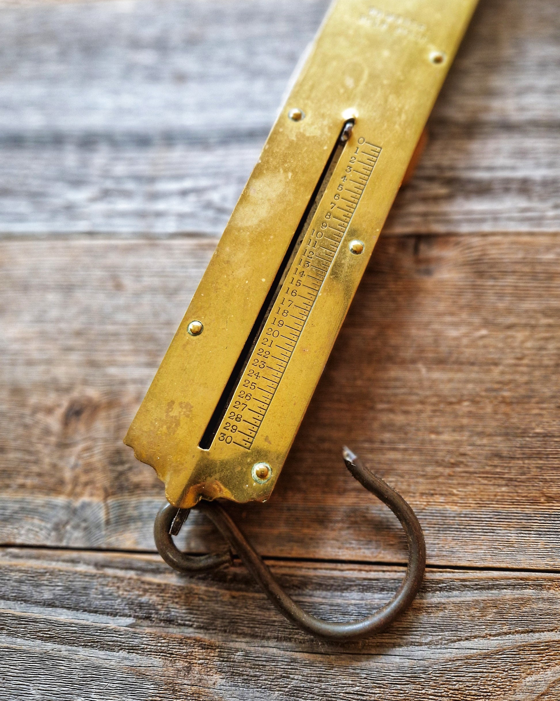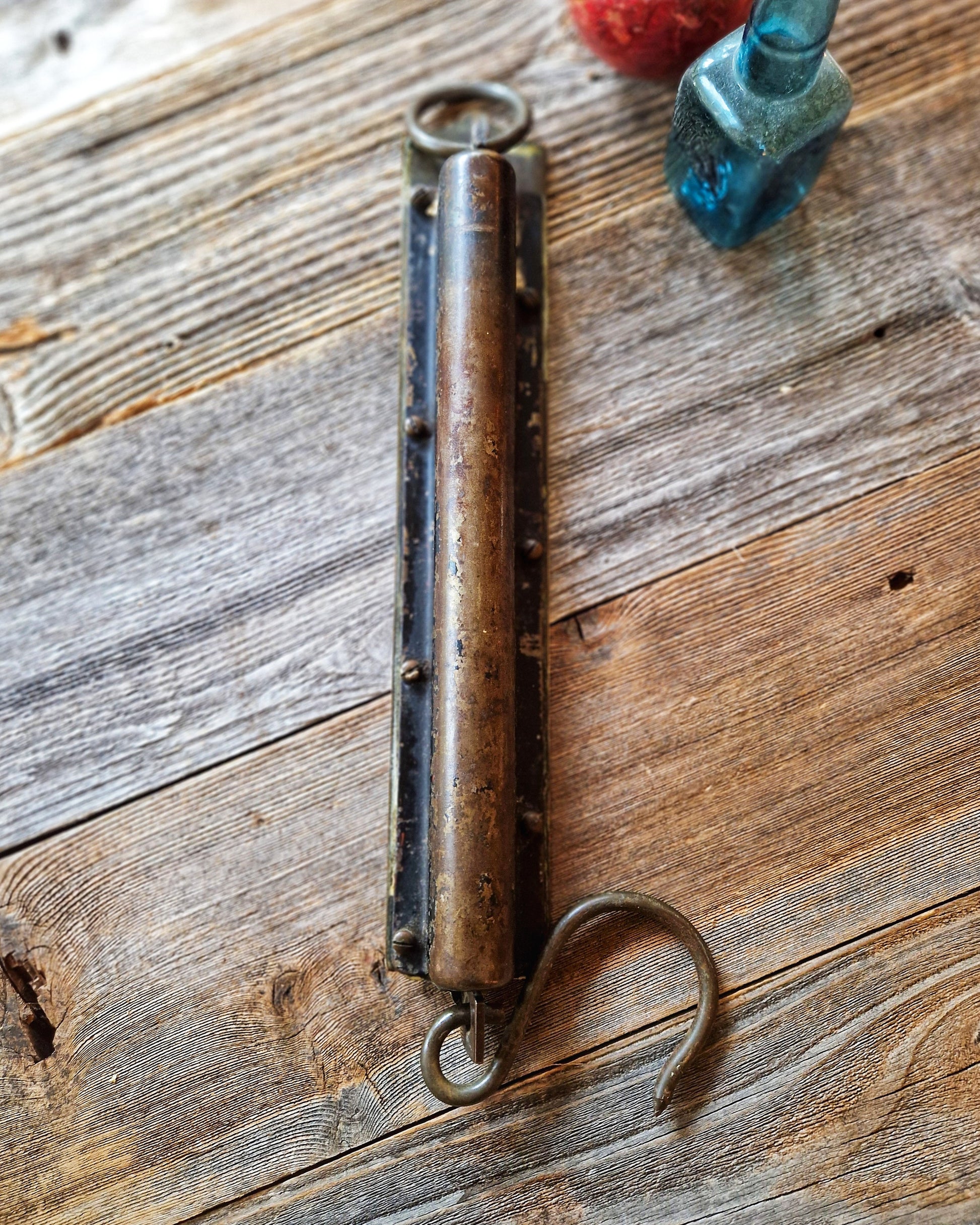 For the tradesman … a vintage 12-inch brass hanging scale, Salter’s Improved Spring Balance No. 2, dating to around 1900–1930 and rated to 30 pounds, with an engraved brass dial, forged iron ring, and matching hook. Once a practical tool of market stalls, fisheries, and country estates, its sturdy construction and clean graphic form make it ideal for display in a gentleman’s kitchen, den, or workshop.